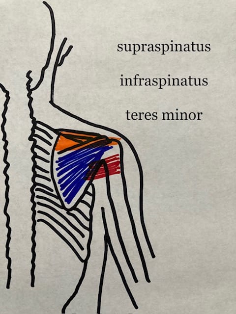 It’s rare for a client to know which of their four muscles are implicated in rotator cuff malfunction, even if the core issue does indeed reside in the muscles. Not to worry as, typically, three of the four muscles of the rotator cuff are worked in any deep tissue back massage: supraspinatus, infraspinatus, and teres minor (see image), which lie deep to the trapezius muscles. The fourth muscle is subscapularis, and it’s the least palpable, as it’s flush with the other side of the shoulder blade, facing the front of the body. But some lateral fibers of subscapularis can be accessed through the armpit.
